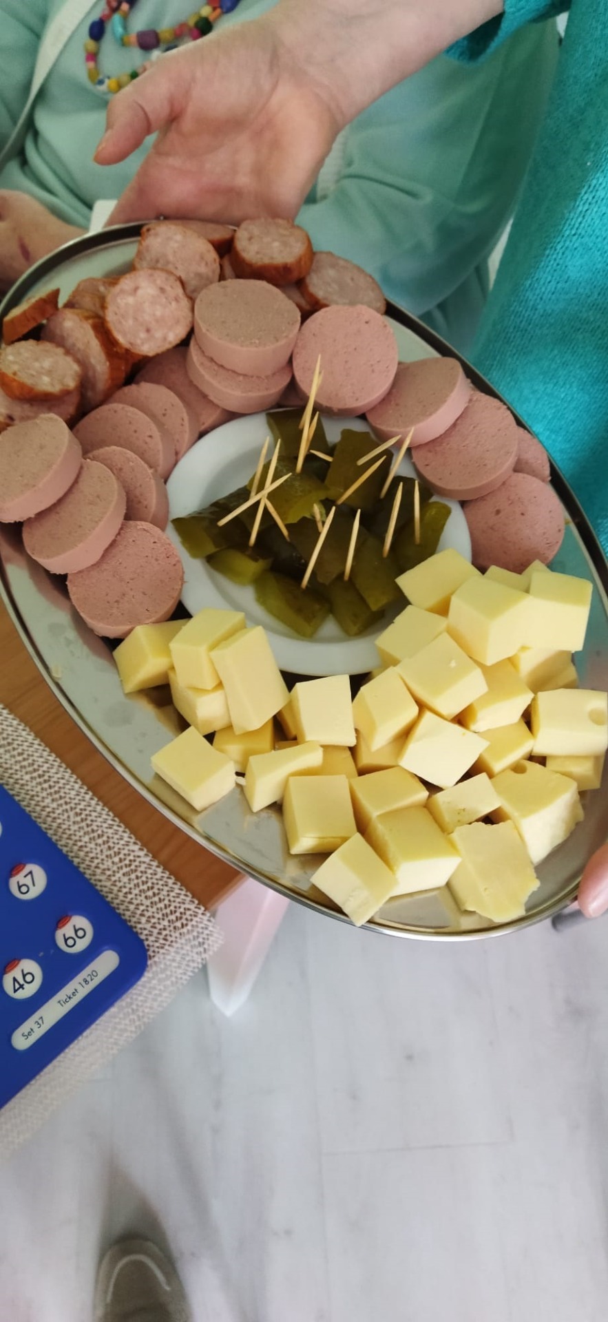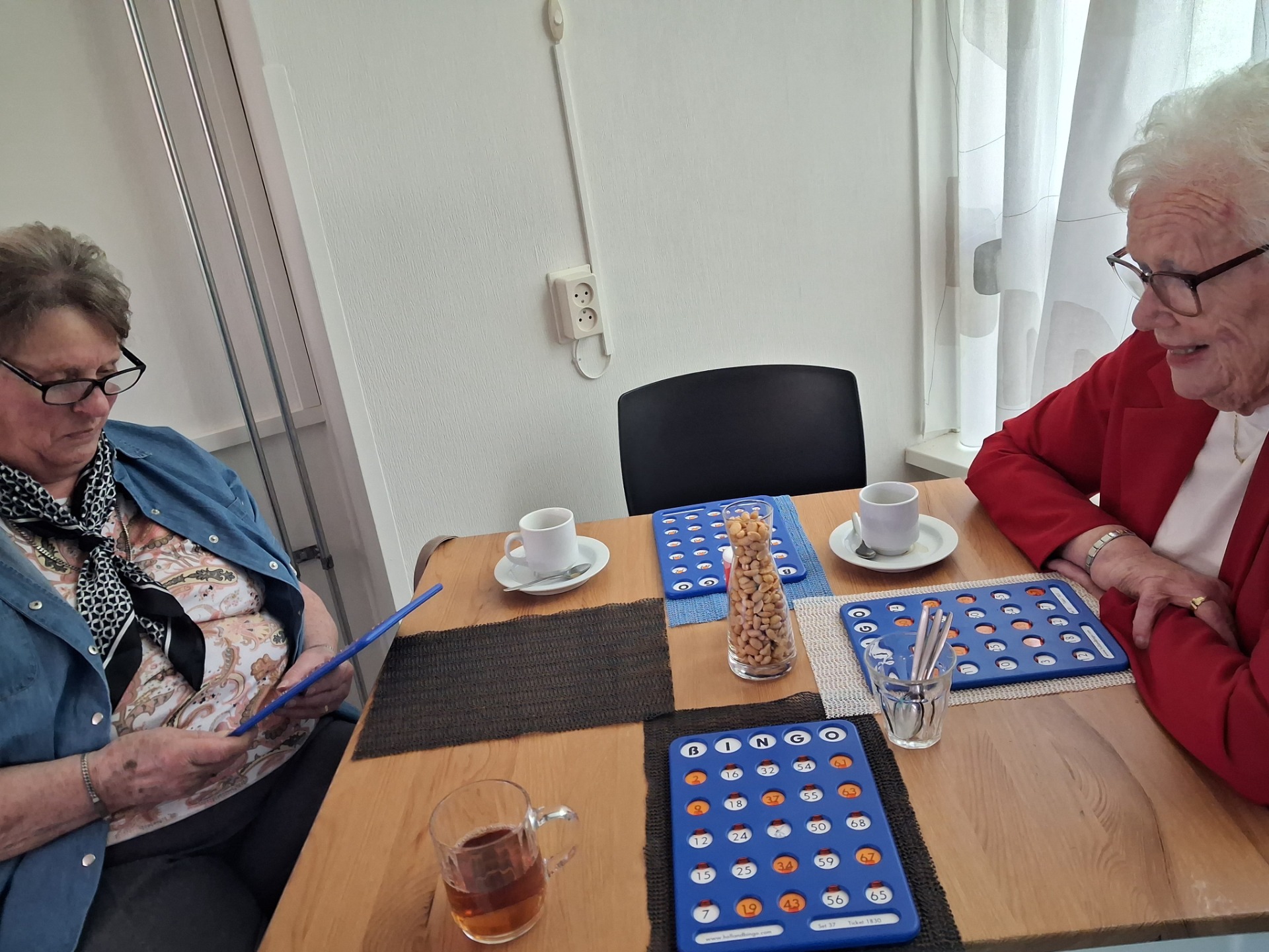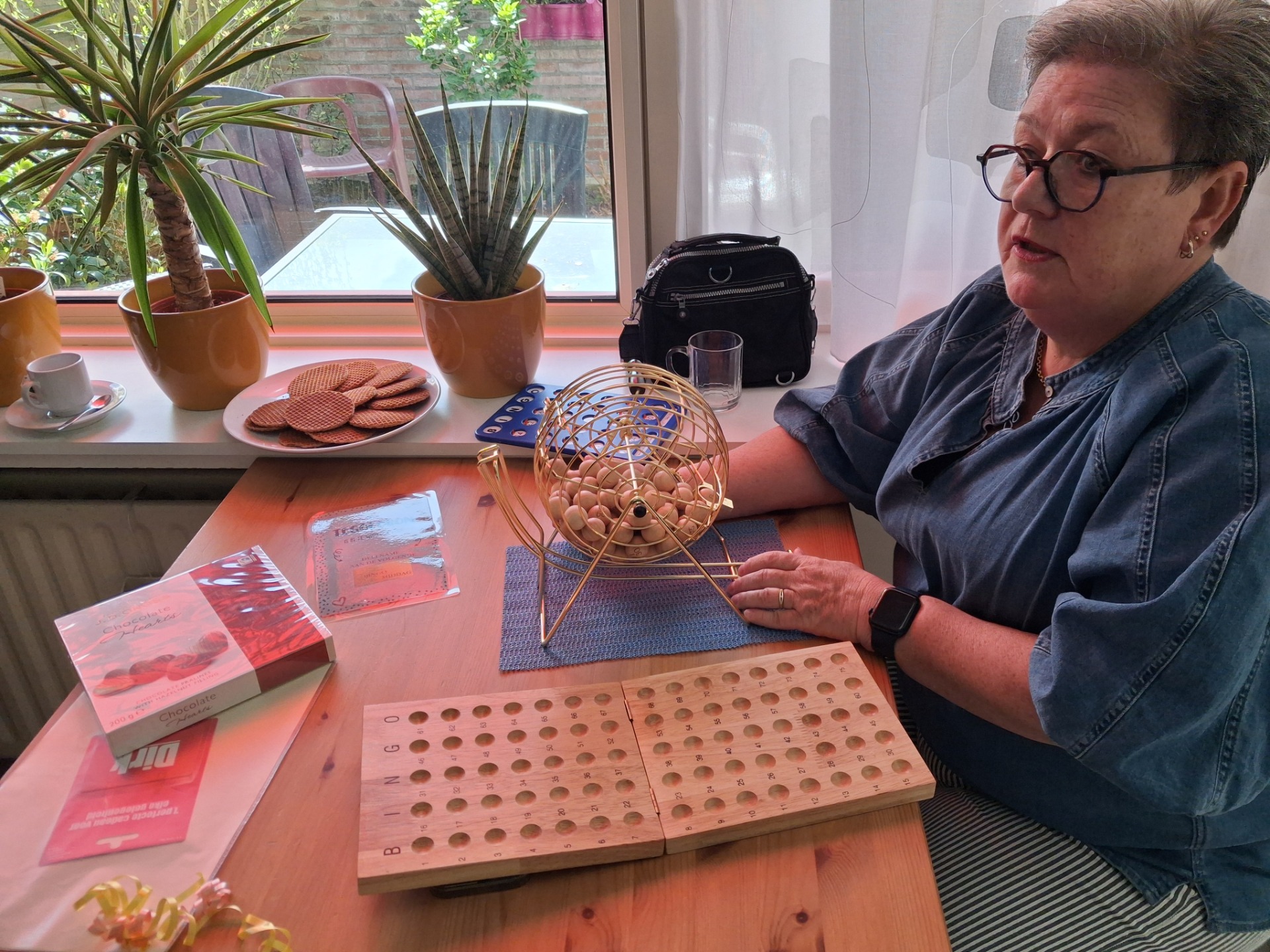 Toen de deelnemers binnenkwamen zijn ze vergast op koffie en thee met een grote grote Goudse stroopwafel. De tafels waren al gedekt met een bingo bord, glaasje met nootjes, diverse chips.na elke bingorond kwam er iemand langs met grilworst, Gelderse worst, kaas en gevulde eieren dus.